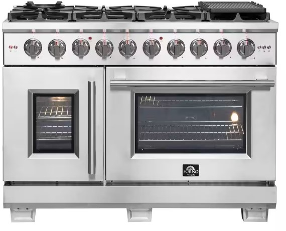 The 48” Forno Capriasca French Door Gas Range brings professional styling and Performance into your home kitchen with its durable stainless-steel design. The gas rangetop has 8 sealed dual-ring brass burners with a total output of 160,000 BTU for simmering melting chocolate or sauces, The heavy-duty continuous cast iron grates allow maximum stability of cookware mobility over a recessed enamel Cooking Surface cavity which keeps spills and splashes contained and easy to clean. Double gas ovens have a combined 6.58 cu.ft. capacity with a total output of 44,000 BTU. encased in a speckled blue enamel interiors and tempered 3-layer glass oven door windows. Right-side oven consists of a convection fan function. Included is an LP conversion kit, 6 stainless steel telescopic oven racks, wok-ring, reversible grill/griddle, rotisserie kit and skewers forks, air fry basket with rack and drip pan. Additionally, zinc coated metal knobs with bezel rings will maintain their beauty for years.Read More