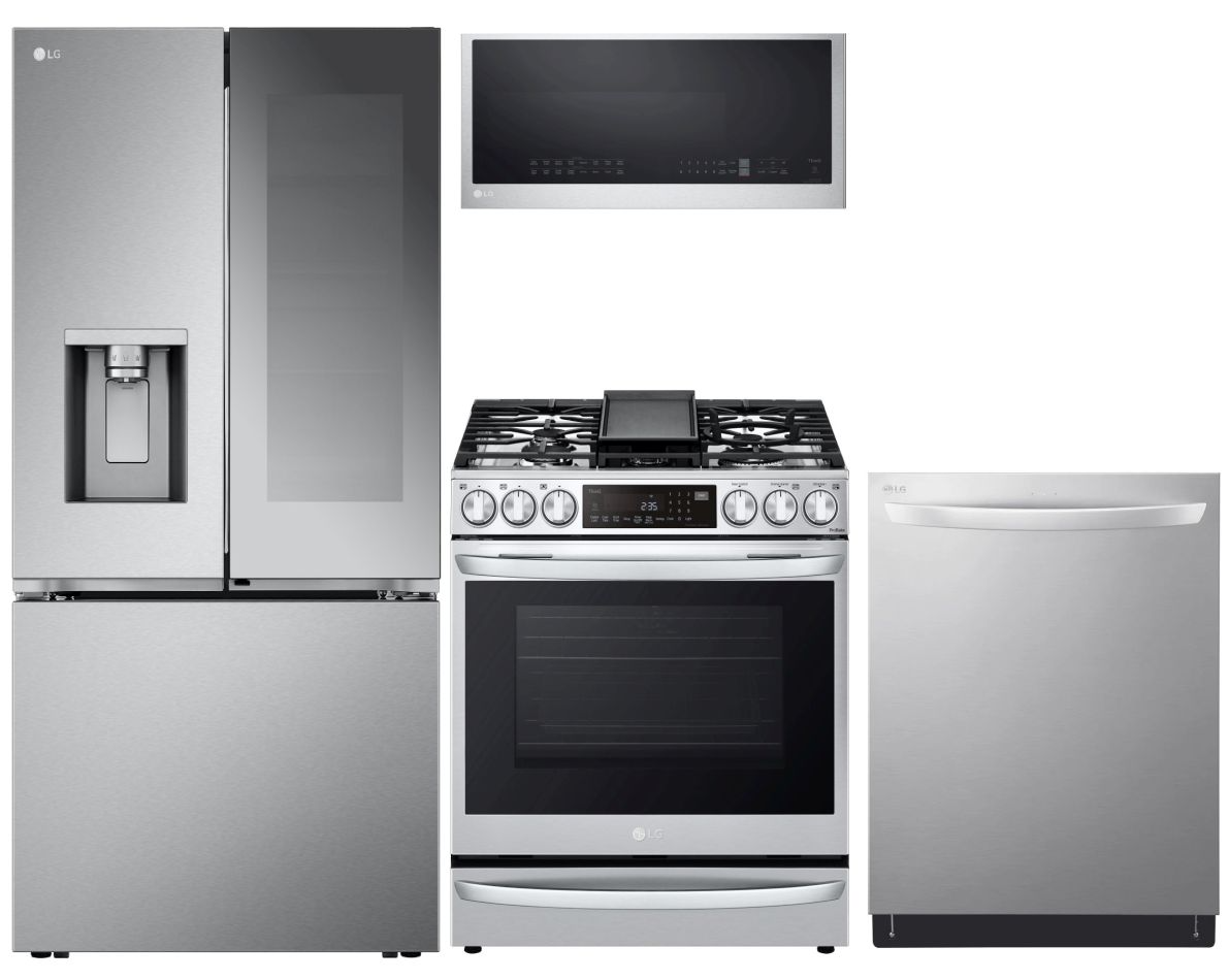 This LG Kitchen Package features a 25.5 Cu. Ft. PrintProof™ Stainless Steel Counter Depth French Door Refrigerator, a 30" PrintProof™ Stainless Steel Slide-In Gas Range, a 24" PrintProof™ Stainless Steel Smart Top Control Built In Dishwasher, a 1.7 Cu. Ft. PrintProof™ Stainless Steel Over The Range Microwave.Read More