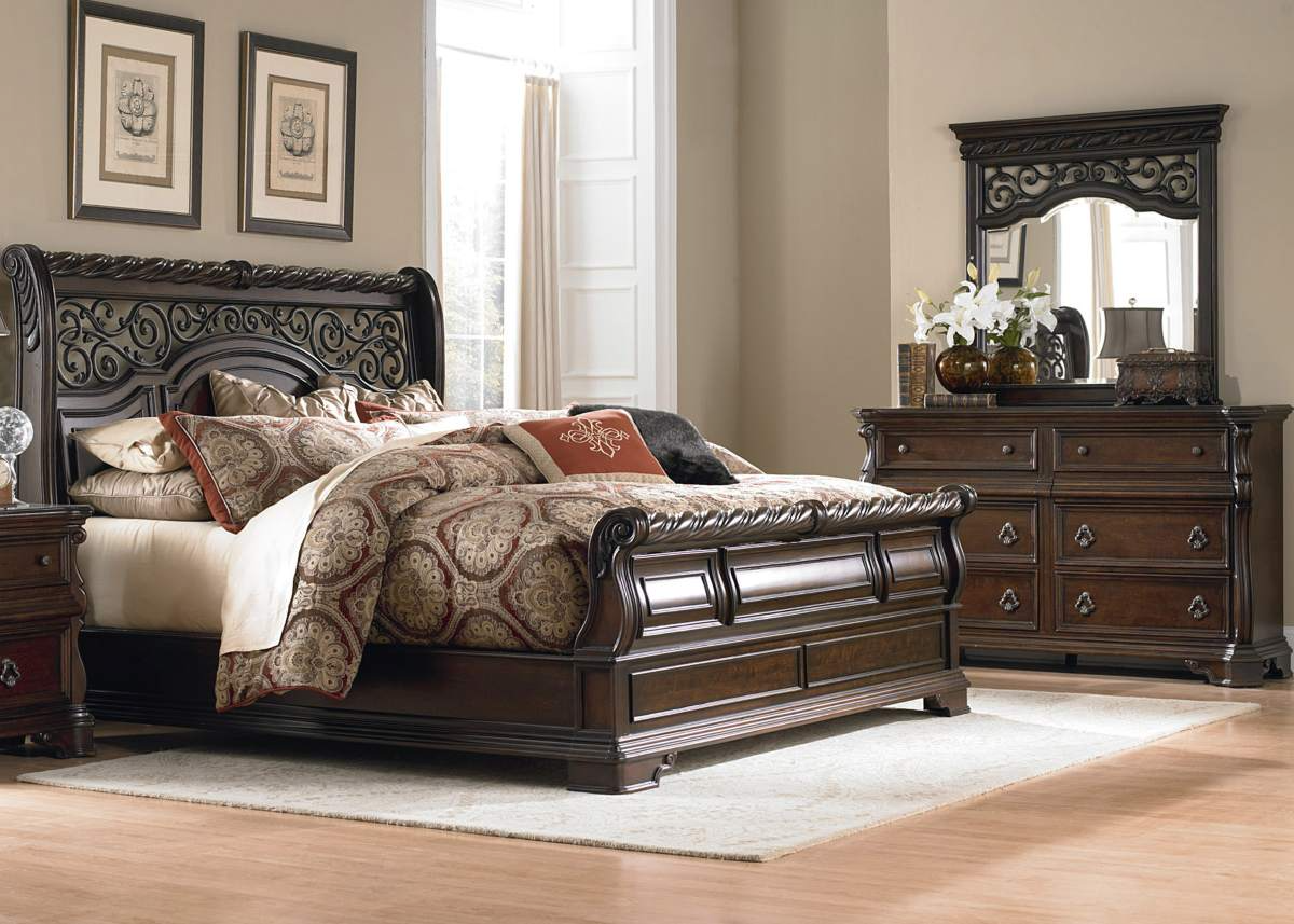 Opt for an elegant display. A refined yet relaxed feel describes the arbor place king sleigh bed, dresser, and mirror. Crafted of poplar solids, birch veneers and metal, this kit features a brownstone finish, four-way match fancy face veneer tops.Read More