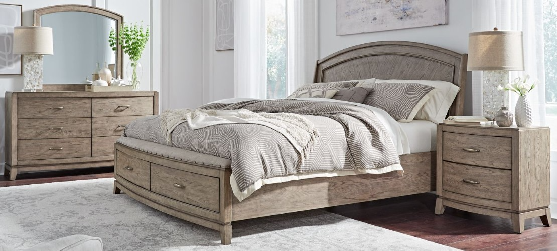 Create a calm and peaceful oasis with the Avalon queen panel storage bed, dresser, mirror, and nightstand. Crafted with excellence using Rubberwood solids and Split Heart White Oak veneers, this set features a Burnished Beige finish. The journey into the enchanting allure of this set begins with the softly arched cap rail of the headboard.Read More