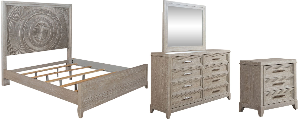 Elevate your luxurious home with the Belmar California king panel bed, dresser, mirror, and nightstand. Crafted of rubberwood solids and split heart oak veneers, this kit features a washed taupe and silver champagne finish, full extension drawers with premium felt lined top drawers and cedar lined bottom drawers.Read More