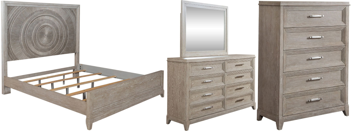 Elevate your luxurious home with the Belmar king panel bed, dresser, mirror, and chest. Crafted of rubberwood solids and split heart oak veneers, this kit features a washed taupe and silver champagne finish, full extension drawers with premium felt lined top drawers and cedar lined bottom drawers.Read More