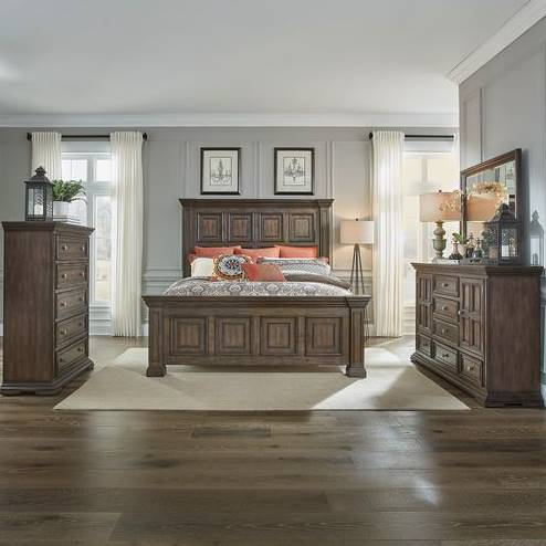 Live life beautifully with the Big Valley California king panel bed, dresser, mirror, and chest. Crafted of rubberwood solids with birch veneers this kit features a brownstone finish with heavy distressing, wood framed doors and drawers.Read More