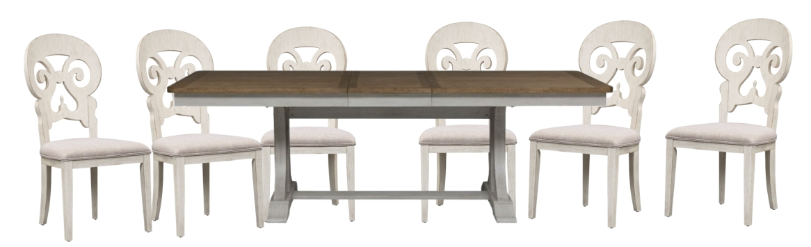 Wow family and friends with the Farmhouse Reimagined seven-piece trestle table set. Crafted of pine and poplar solids with hickory and pine veneers, this set features an antique white finish with heavy wire brush distressing and a chestnut top and consists of the trestle table and six splat back side chairs.Read More