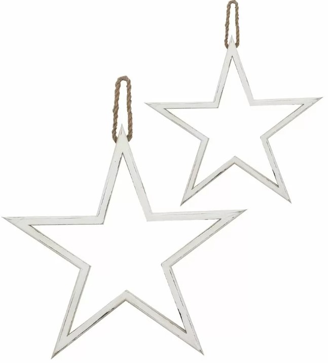 Set of two modern farmhouse stars. Each is finished with a distressed white frame. Add style to your home and elevate your wall with this eye-catching piece.Read More