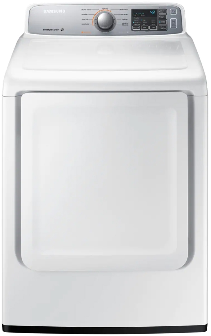 Samsung 7.4 Cu. Ft. White Front Load Gas Dryer with reversible door, sensor dry and child lock.Read More