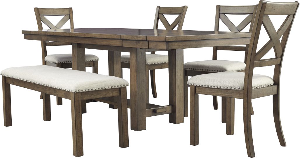 Set Includes: Rectangular Dining Room Extendable Table (D631-45); Dining Bench (D631-00); (4) Dining Chairs (D631-01)