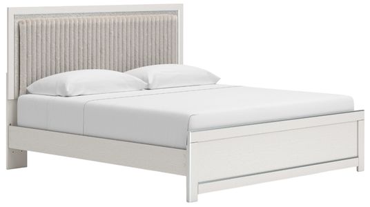 Includes upholstered panel headboard, panel footboard, platform rails and roll slats